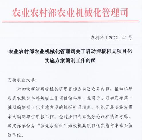 本网讯 近日,农业农村部农业机械化管理司向学校来函,确定我校为“防泥水油封”短板机具项目化实施方案牵头编制单位,工学院陈永新教授为项目化实施方案编制工作牵头专家。