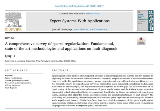 本网讯 近日,《Expert Systems with Applications》期刊(中科院一区Top期刊,IF:8.665)刊发工学院机械工程系李庆副教授在机械装备故障诊断领域的综述性文章“A Comprehensive Survey of Sparse Regularization: Fundamental, State-of-the-art Methodologies and Applications on Fault Diagnosis”。该综述论文用近2万字系统梳理和总结了近20年稀疏正则化理论及其机械故障诊断的研究进展,详细描述了12类主流稀疏正则化模型与演变算法、7类Benchmark模型求解算法与演变算法以及典型工程应用,并对机械装备故障诊断研究领域目前存在的热点问题和未来的发展方向进行了深入剖析和展望,为后续故障诊断领域科研学者与技术人员提供有益参考。