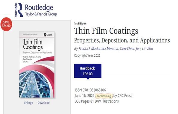 本网讯 我校讲习教授Tien-Chien Jen与工学院朱林教授、Fredrick Madaraka Mwema博士合作编写的机械工程类著作‘Thin Film Coatings Properties, Deposition, and Applications’(ISBN 9781032065106),将于近期由国际知名出版社Taylor & Francis 出版。该著作是工学院的第一本英语学术著作,主要阐述基于薄膜沉积的机械损伤部件修复的理论及应用。