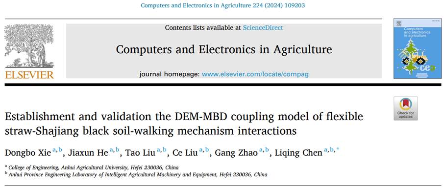近日,实验中心在《Computers and Electronics in Agriculture》(中科院1区TOP,IF=7.7)发表题为 “Establishment and validation the DEM-MBD coupling model of flexible straw–Shajiang black soil–walking mechanism interactions” 的研究论文。该研究针对秸秆还田条件下农机行走机构在田间作业过程中与“土壤–柔性秸秆”复合介质相互作用机理不清、仿真精度不足的难题,提出了一种融合离散元法(DEM)与多体动力学(MBD)的耦合建模方法,实现了对秸秆变形特性与土壤颗粒运动行为的高精度协同模拟,显著提升了复杂田间工况下农机–地表系统力学响应预测的可靠性。